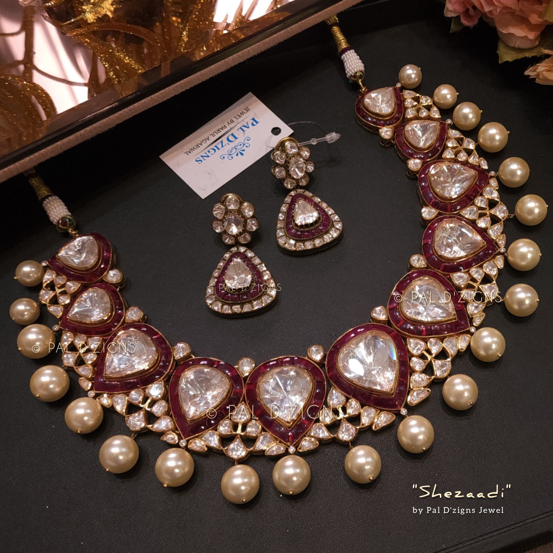 Stones: It has an Excellent Lustre of Moissanite Polkis which are the best substitute for Real Polkis. These polkis have Silver Daak at the Backside and are set in an open setting. Big polkis are set in a Closed jaali setting from the backside.
