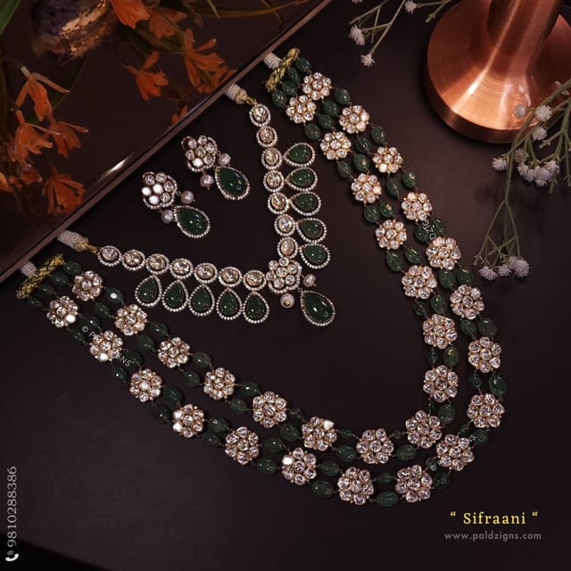 Stone: It has an Excellent Lustre of Moissanite Polkis which are the best substitute for Real Polkis. These polkis have Silver Daak at the Backside and are set in an open setting.