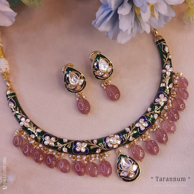 Stone: It has an Excellent Luster of Moissanite Polkis which are the best substitute for Real Polkis. These polkis have Silver Daak at the Backside and are set in an open setting with closed jaali back.