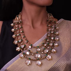 Stone: It has an Excellent Lustre of Moissanite Polkis which are the best substitute for Real Polkis. These polkis have Silver Daak at the Backside and are set in an open setting with closed jaali back setting.